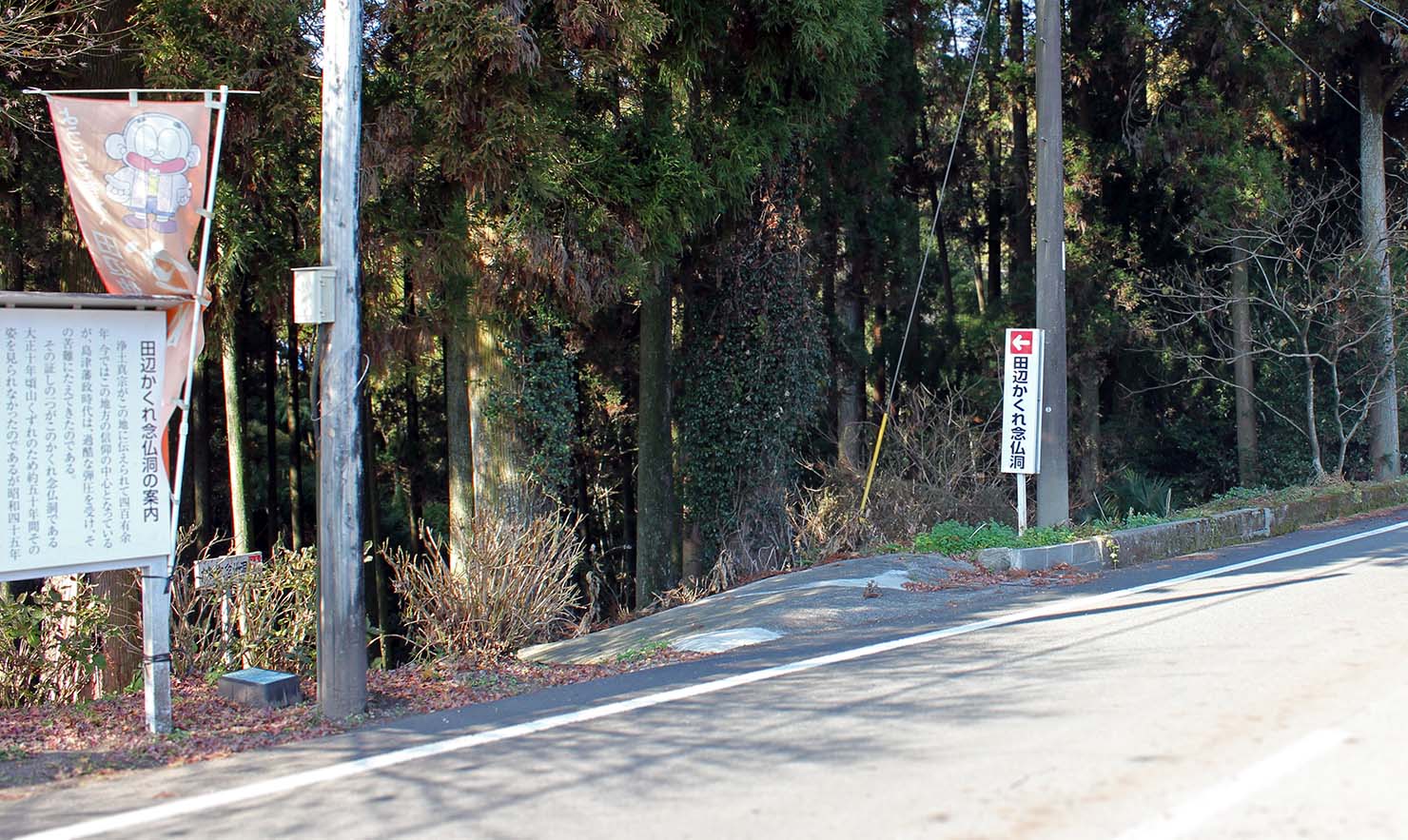 「田辺かくれ念仏洞」の看板が通り沿いに立っている