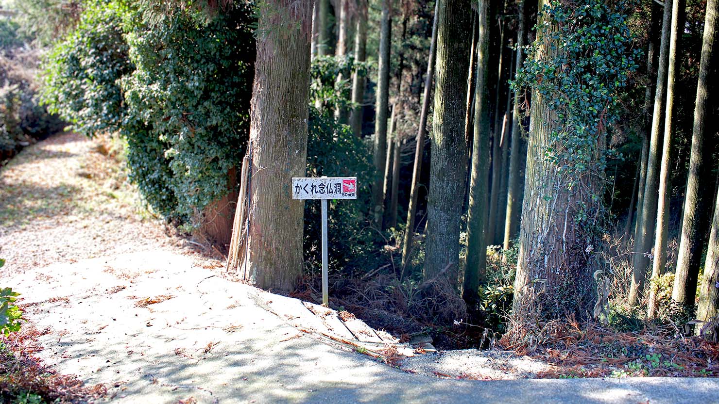 通り沿いから、簡易的に整備された山道を50mほど下っていったところに田辺かくれ念仏洞はあった。