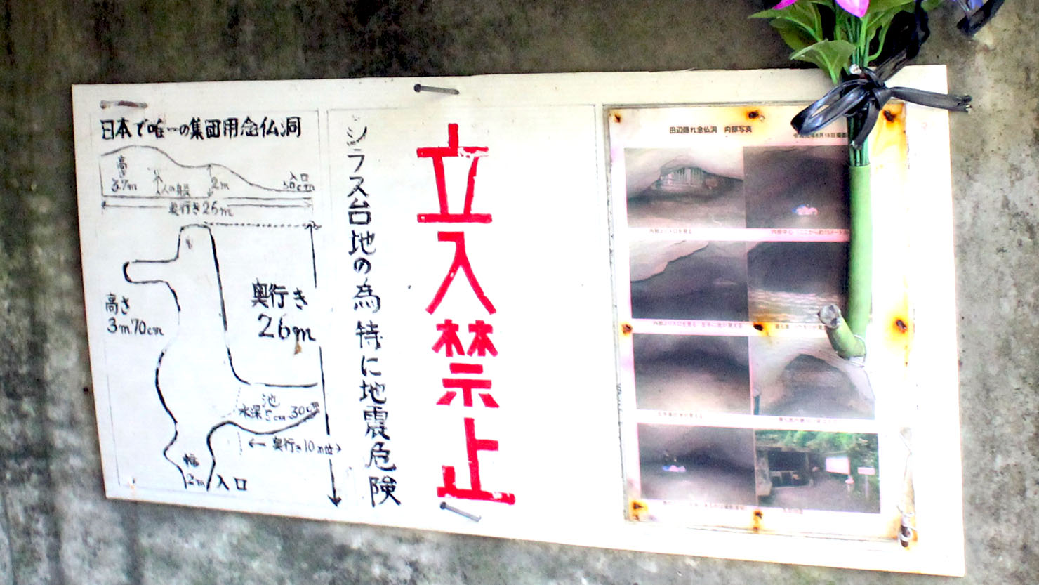 田辺かくれ念仏洞の入り口。中には洞穴が広がり、池もあったようだ。現在は立ち入ることができない