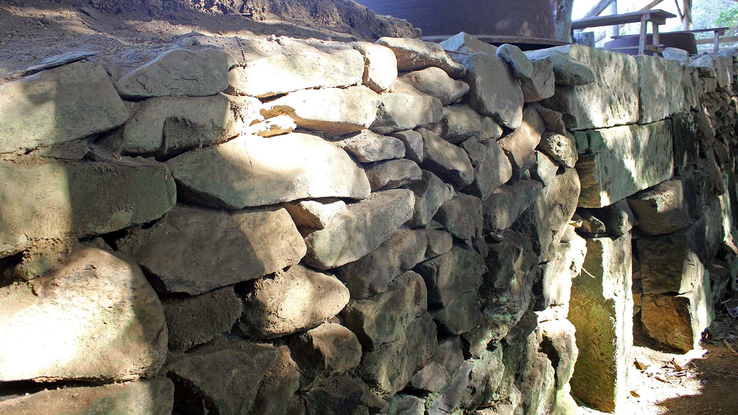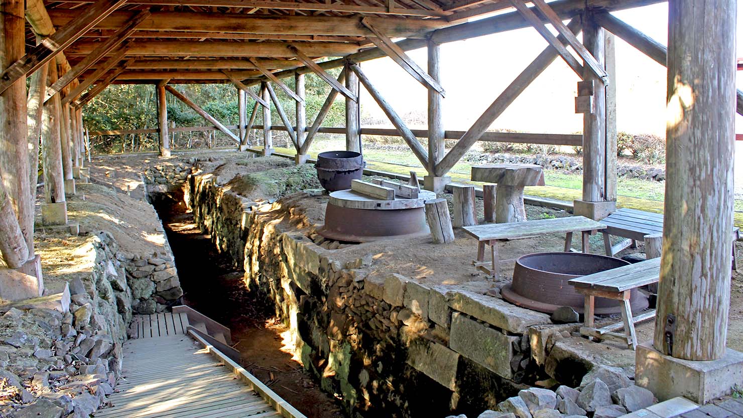 窯は直径130cm、高さ180cmほどで、切石が積まれ、隙間を埋めるように石が詰め込まれている。人一人が余裕で入れるほどの巨大な釜で湯を沸かすには、たくさんの薪をくべ、ゴウゴウと火を起こす必要がある。狭い工場は、灼熱だっただろう。