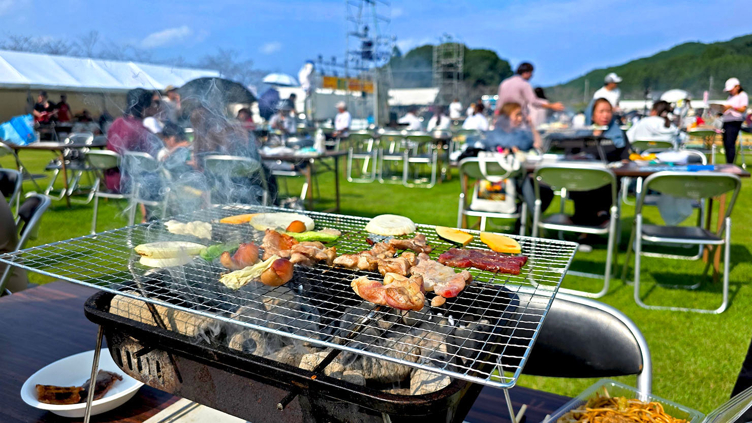 昼間の焼肉カーニバルは晴れ間ものぞき、盛況となった。雨天順延で学校の運動会などと重なる日曜の開催。人出が減る心配もあったが、結果として過去最多となる5万5000人が来場。日中は、約3200席用意した焼き場で家族連れなどが焼肉を堪能した。