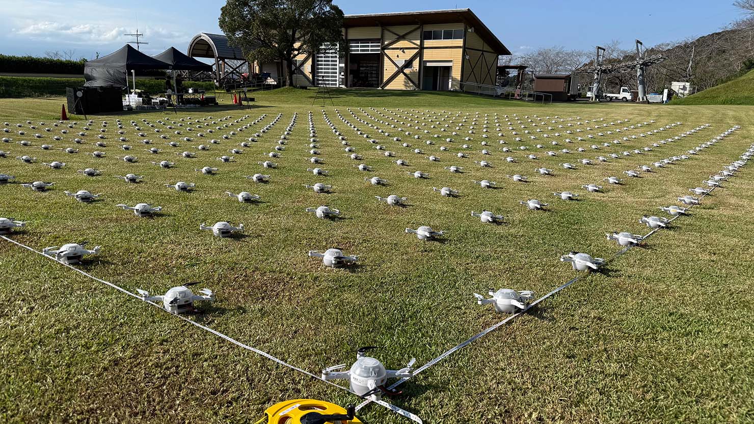 整然と並べられ離陸を待つ500機のドローン。電池はまだ装填していない(都城観光協会提供)