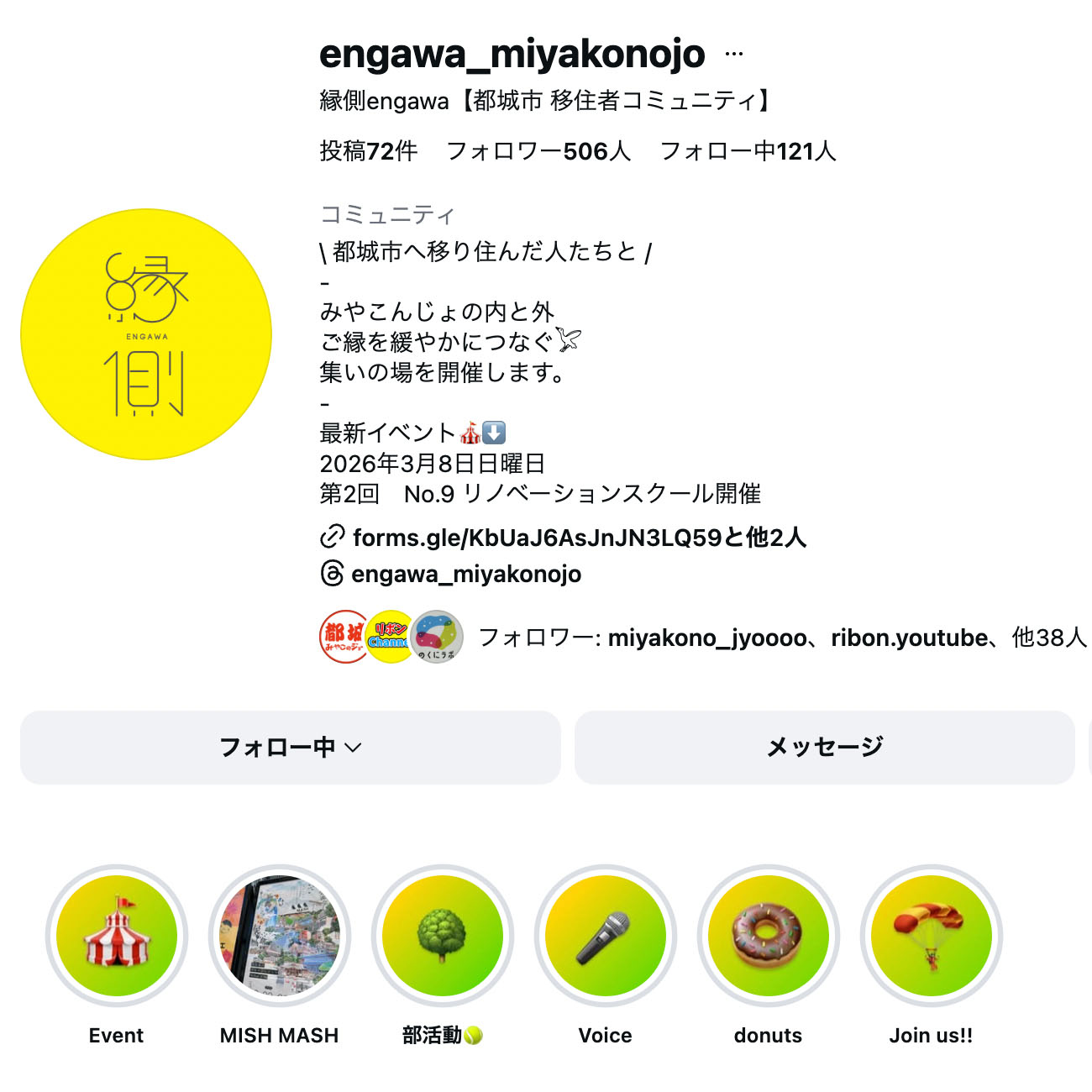 Instagramアカウントのプロフィールには「みやこんじょの内と外 ご縁を緩やかにつなぐ」とある